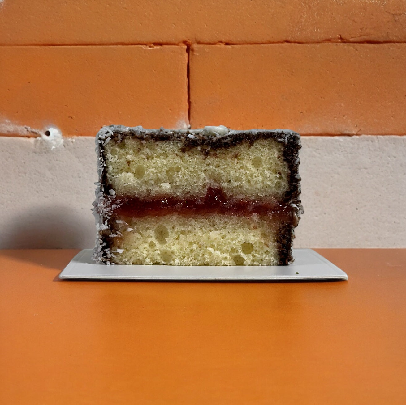 Madagascar vanilla sponge, strawberry jam, chocolate soak, coconuts.