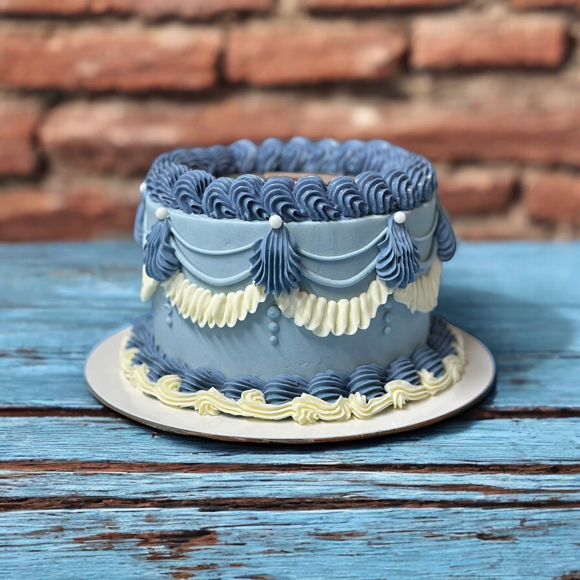This exquisite round cake evokes a sense of tranquil elegance with its calming color palette and intricate piping details.