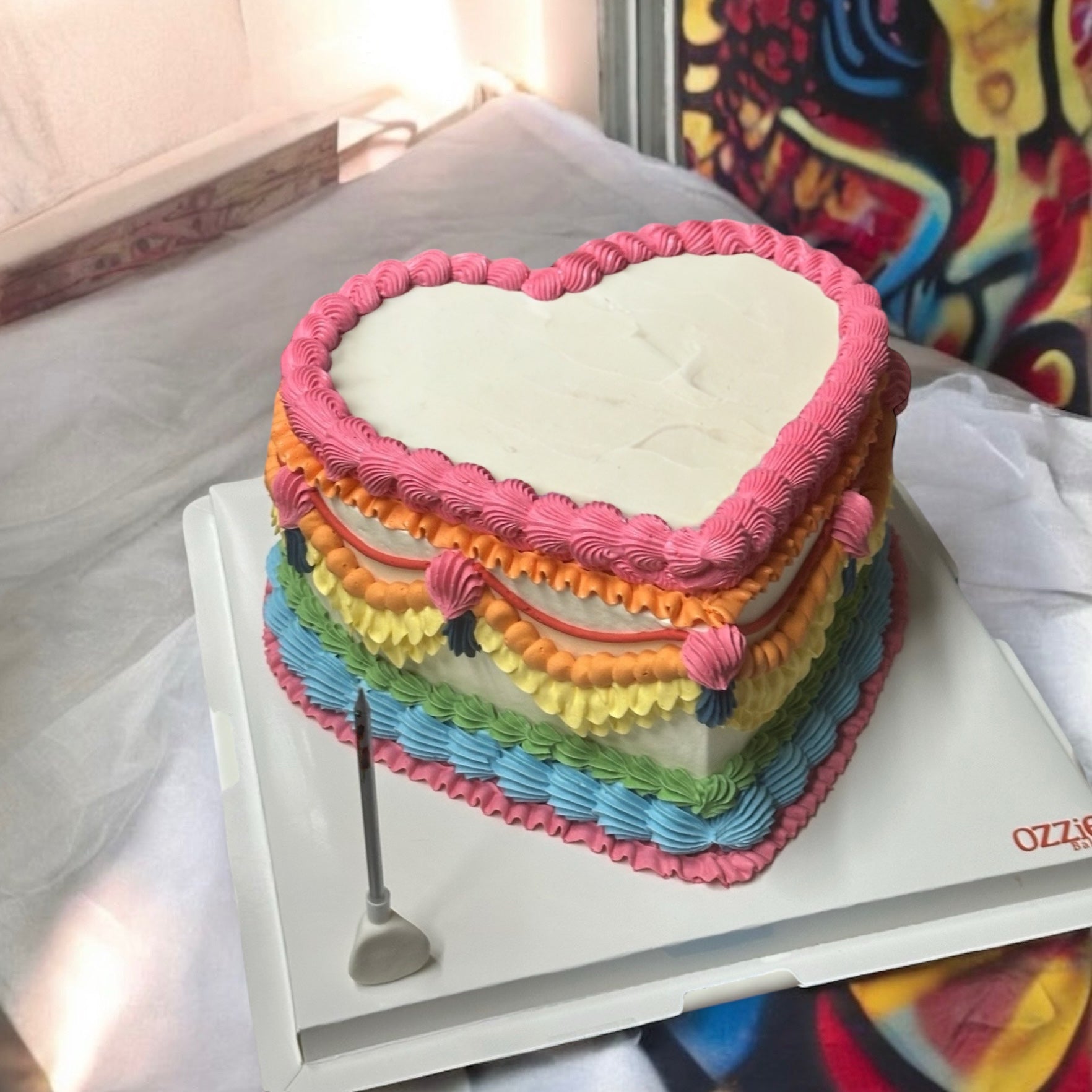 The charming heart-shaped cake in approx 4" tall, adorned with vibrant rainbow-colored buttercream piping. The outer layer of the cake is frosted and piped with buttercream.