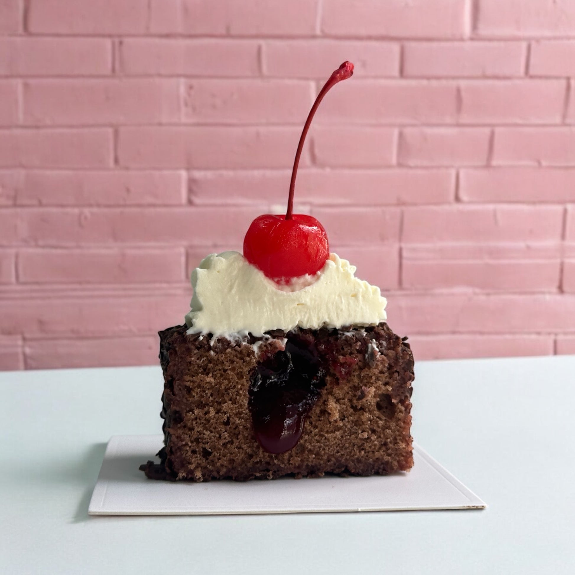 Chocolate Sponge, cherry Jam, vanilla whipped cream, black currant jelly coating, chocolate shavings