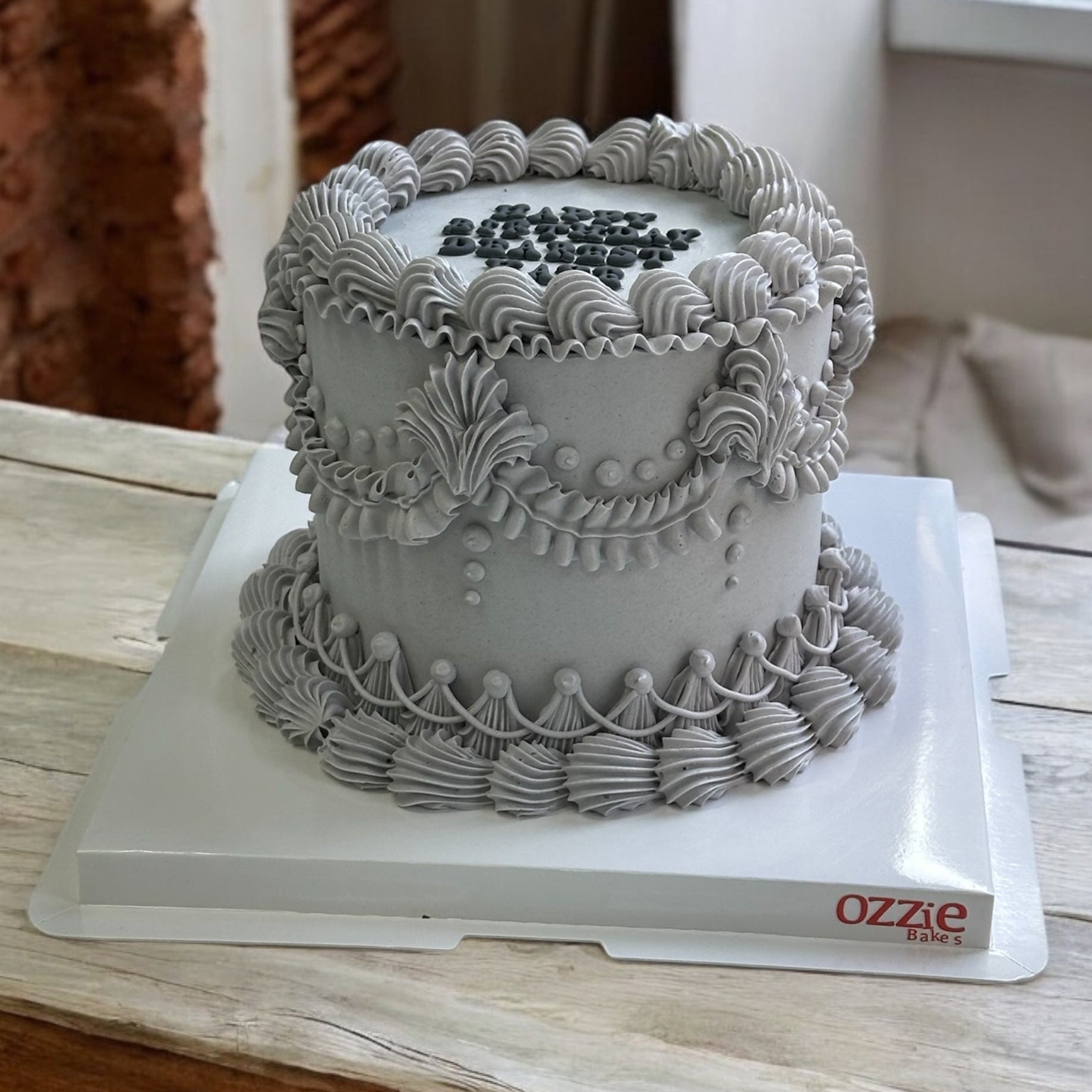 This cake is meticulously decorated with intricate piped patterns, featuring delicate swags and frilled borders that create a layered, textured look.